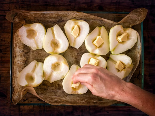 Груши вымойте, разрежьте пополам и аккуратно удалите сердцевину ложкой. Кожуру снимать не нужно – при запекании она поможет сохранить форму и сок внутри. Если груши крупные, каждую половину можно разрезать еще раз, на четвертинки.